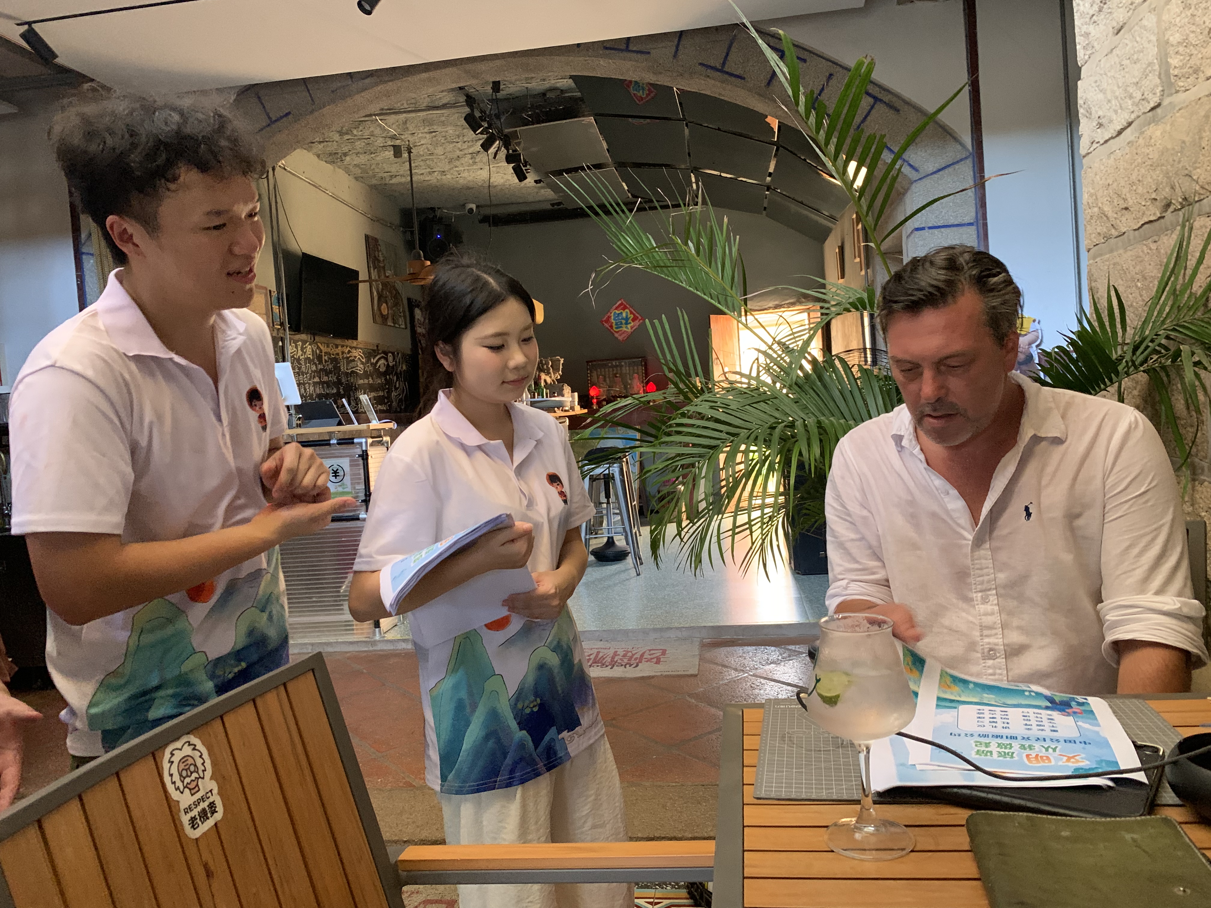 图为实践队队员在沙美社区网红餐厅拍摄文明旅游公益广告视频理性消费片段 苏伊俊 摄