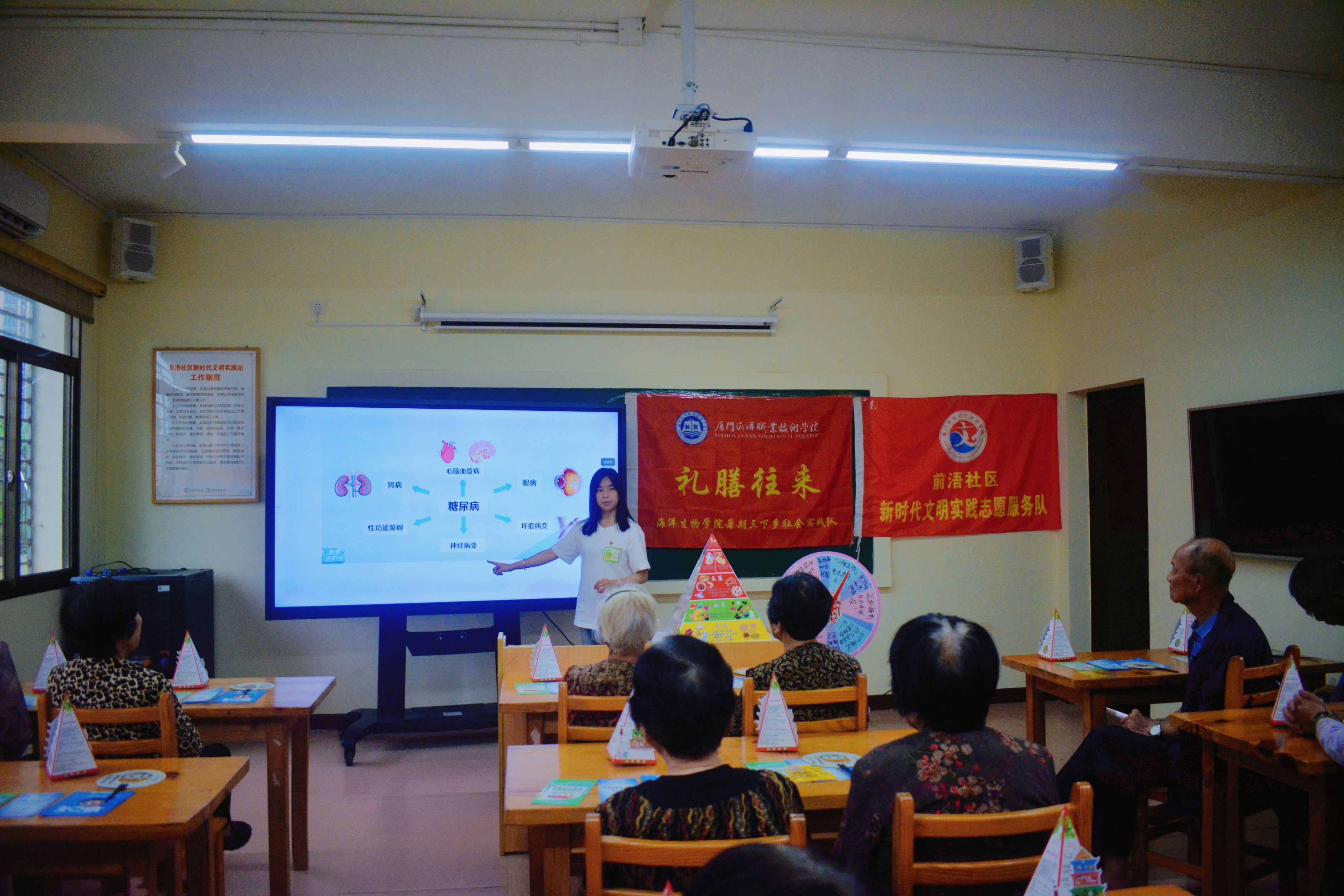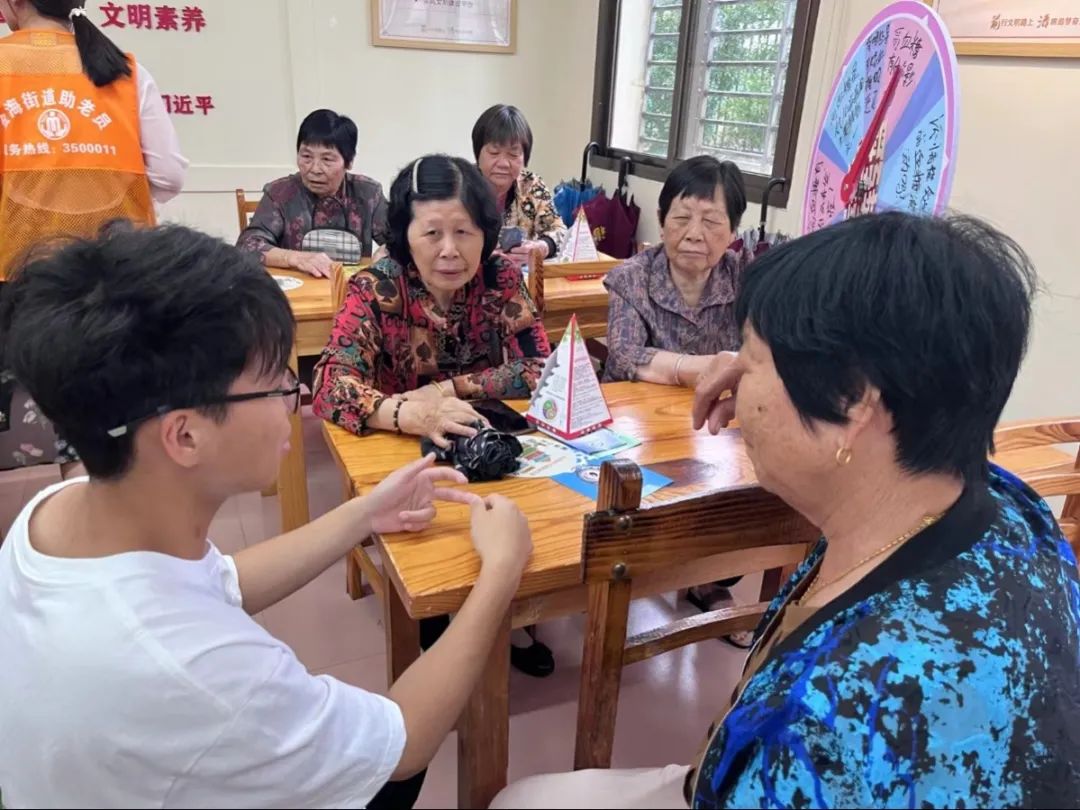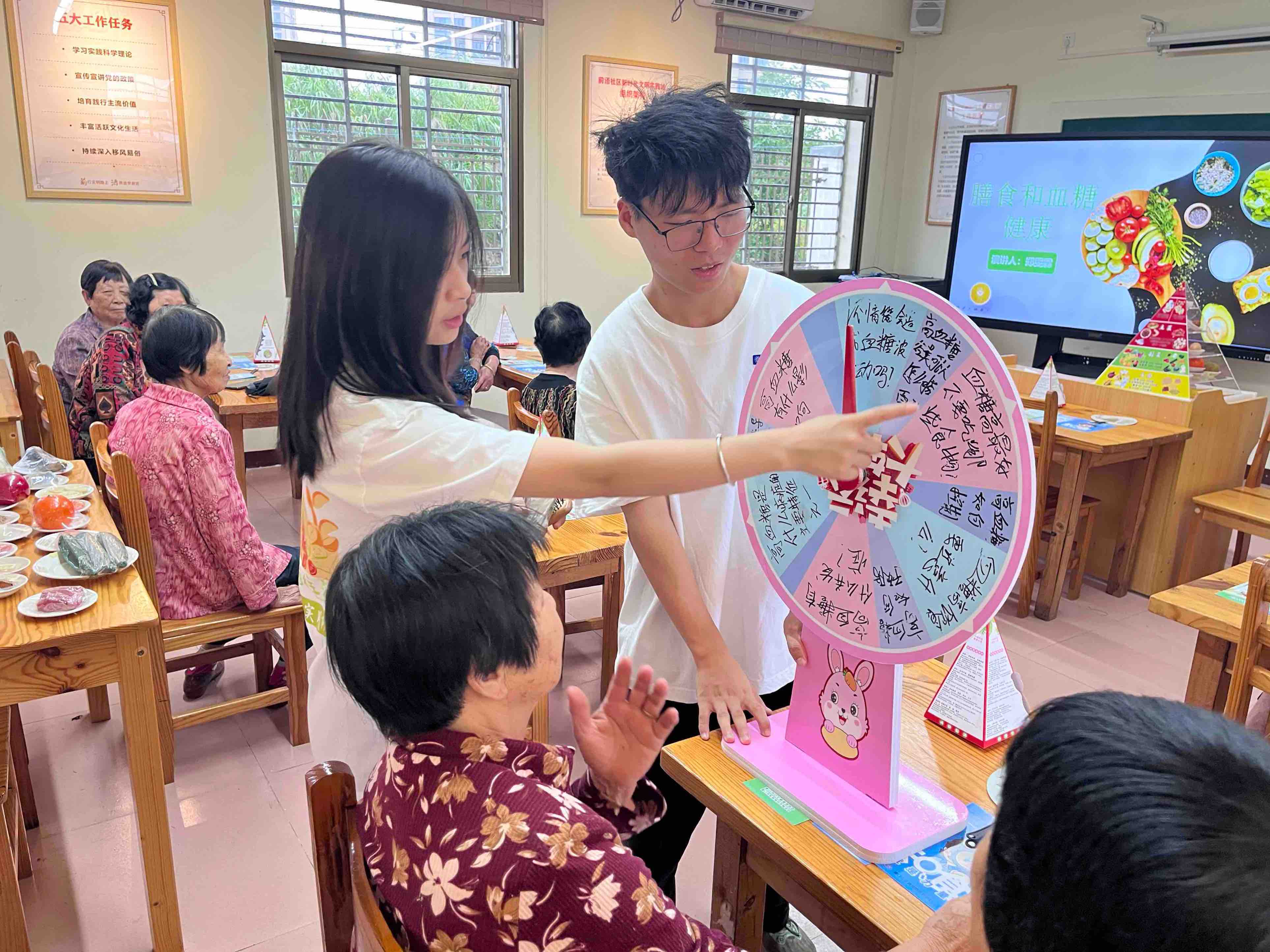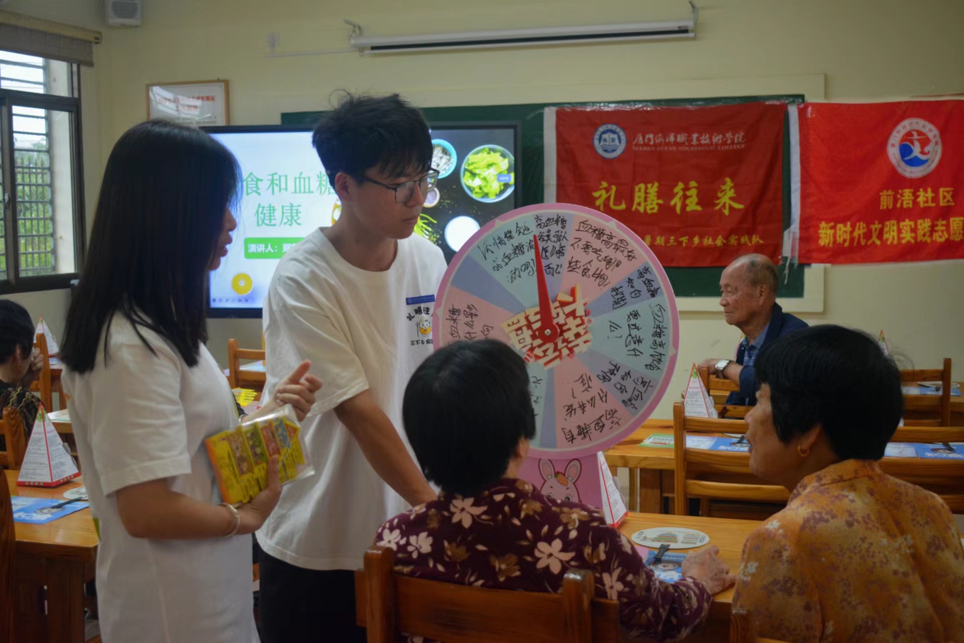 “礼膳往来”实践队队长郑雯霖结合自身食品检验检测技术的食品专业知识针对村民糖尿病的膳食问题开展科普宣传,详细讲解了合理膳食的重要性、膳食宝塔的结构以及各类食物的营养价值、糖尿病预防与糖尿病患者该如何合理膳食。实践队还组织了“高血糖知识转盘抢答大赛”趣味科普活动,带领老人们利用所学知识积极参与高血糖预防行动,提升了社区居民对膳食营养知识的认知度,增强了社区凝聚力,营造健康向上的生活氛围。