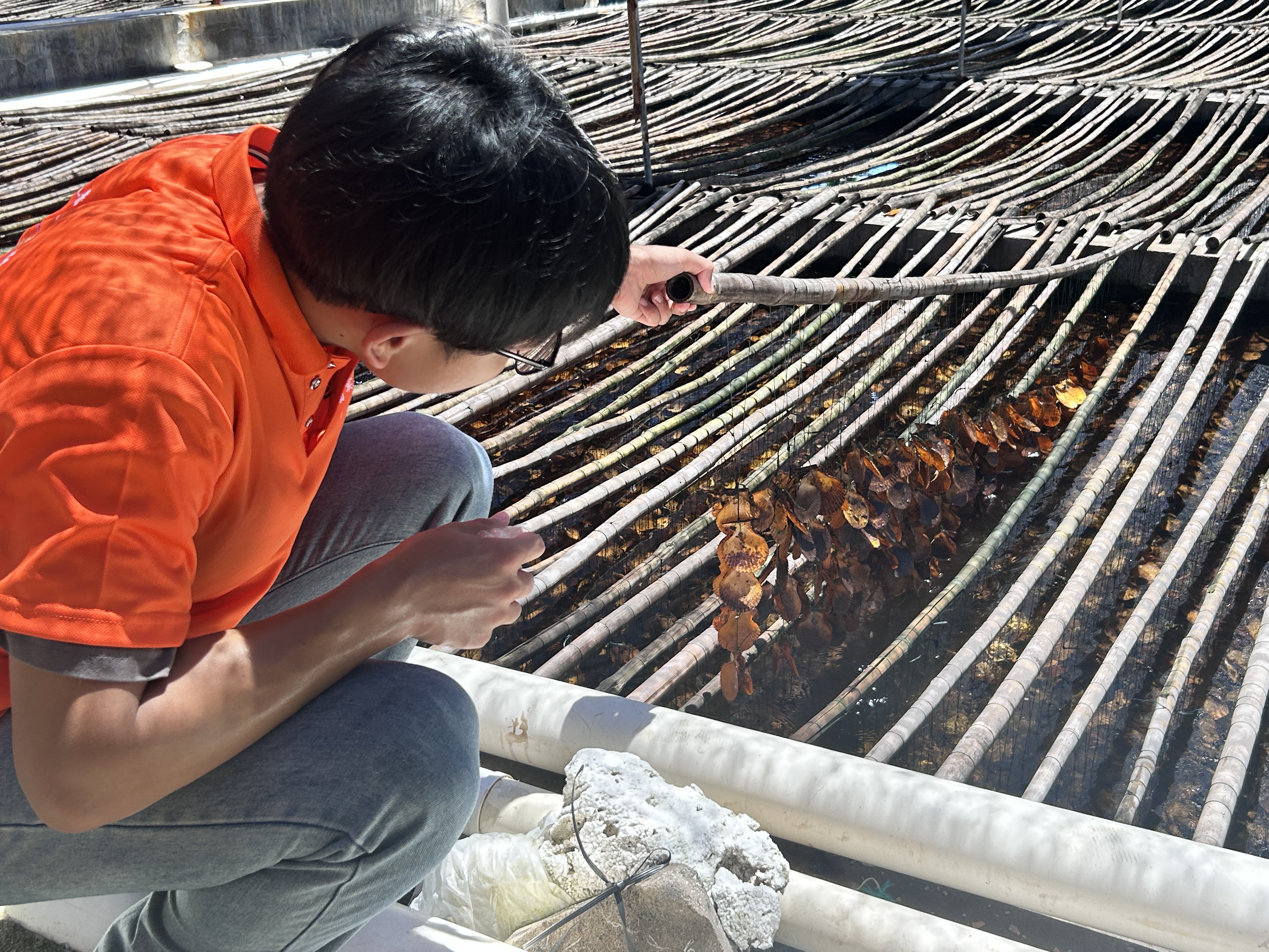 亲营村是东山岛紫菜第一村,背靠亲营山,面朝乌礁湾,海域中海水清澈,盐度适宜,并拥有适合紫菜生长的天然洋流运动。依托于东山岛纯净无污染的海域水质,东山亲营紫菜成为国家地理性标志产品。上午,实践队成员对亲营村紫菜育苗基地进行实地的调研,通过了解育种场的养殖规模、养殖情况和紫菜苗种的发育状态等具体情况,开展针对性技术指导服务。实践队参观了福建省远扬藻业股份有限公司,对紫菜、海带等大型海藻以及螃蟹等水产品的初步加工实际情况等方面,收集和探讨加工过程中存在的问题以及如何确保产品质量稳定性的一手资料,为后续科研工作积累了宝贵数据。