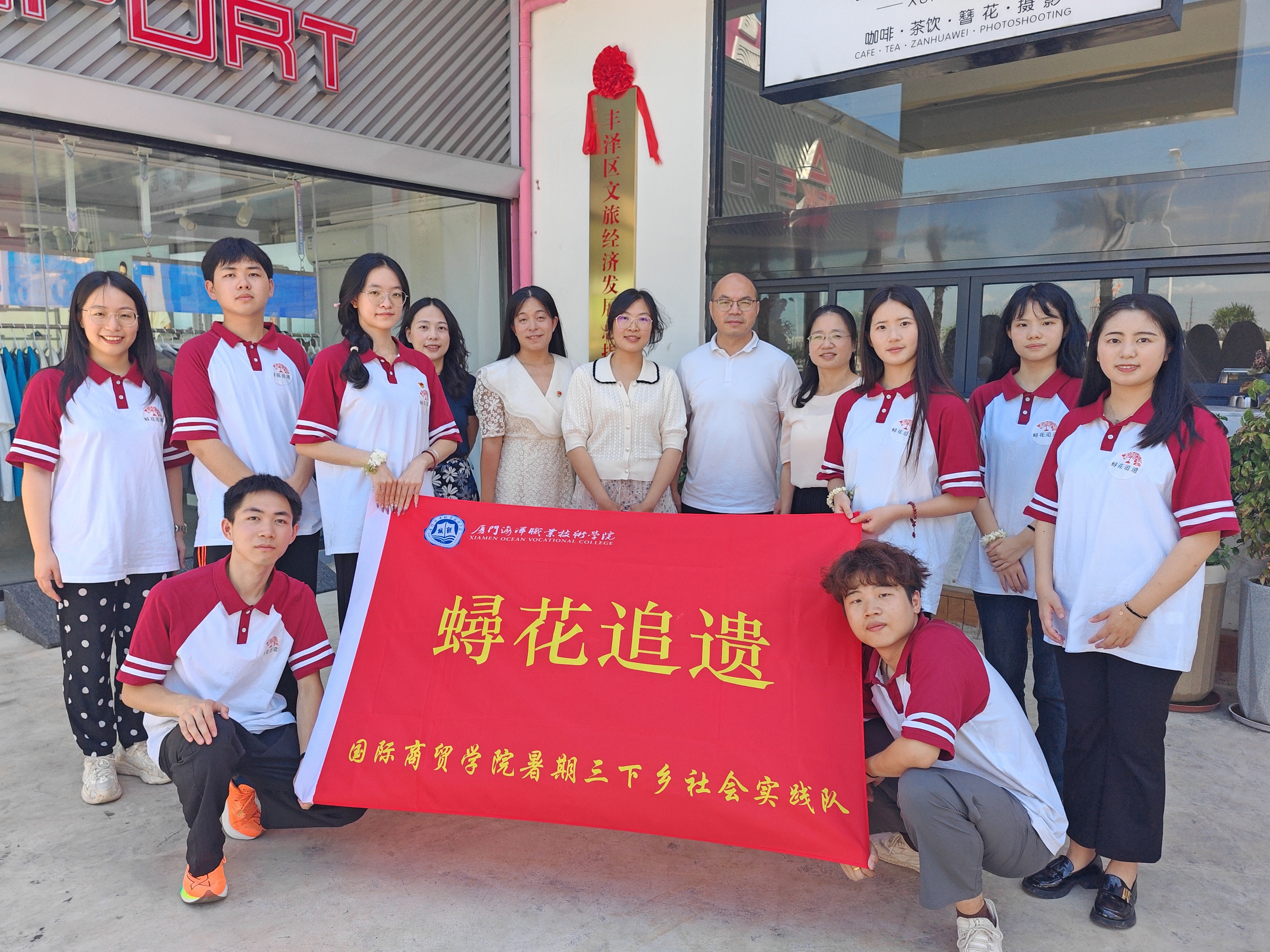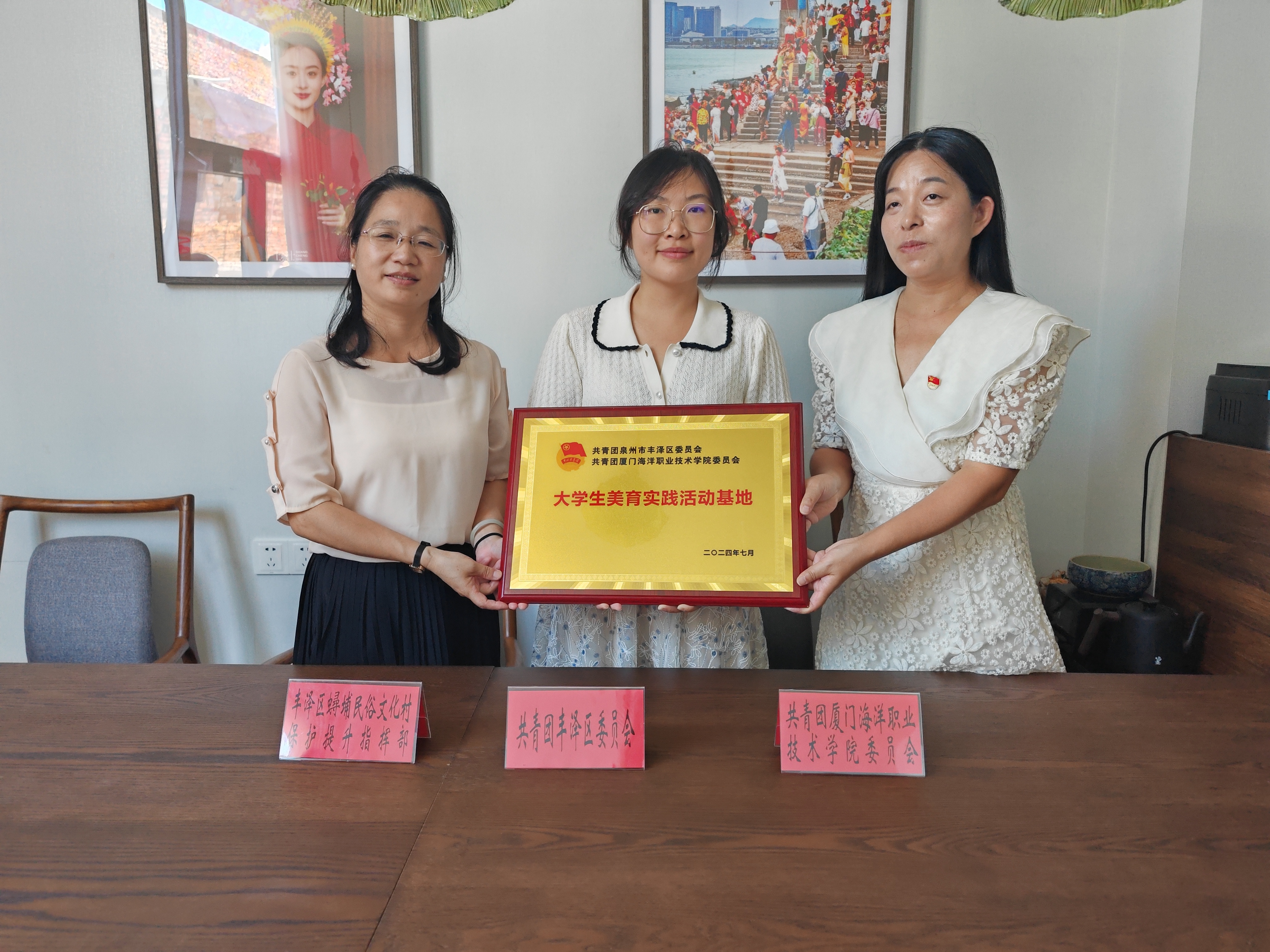 本次“蟳花追遗”实践队“三下乡”实践活动也得到了厦门海洋职业技术学院团委、泉州市丰泽区相关部门的高度关注和大力支持。为了引导大学生自觉走向与实践相结合的成才之路,帮助大学生在实践中受教育、长才干、做贡献,鼓励更多人积极深入学习非遗文化,传承中华文化精髓,共青团厦门海洋职业技术学院委员会与共青团泉州市丰泽区委员会在泉州市丰泽区蟳埔民俗文化村保护提升指挥部签署了《共建大学生美育实践活动基地协议》并举行了授牌仪式。