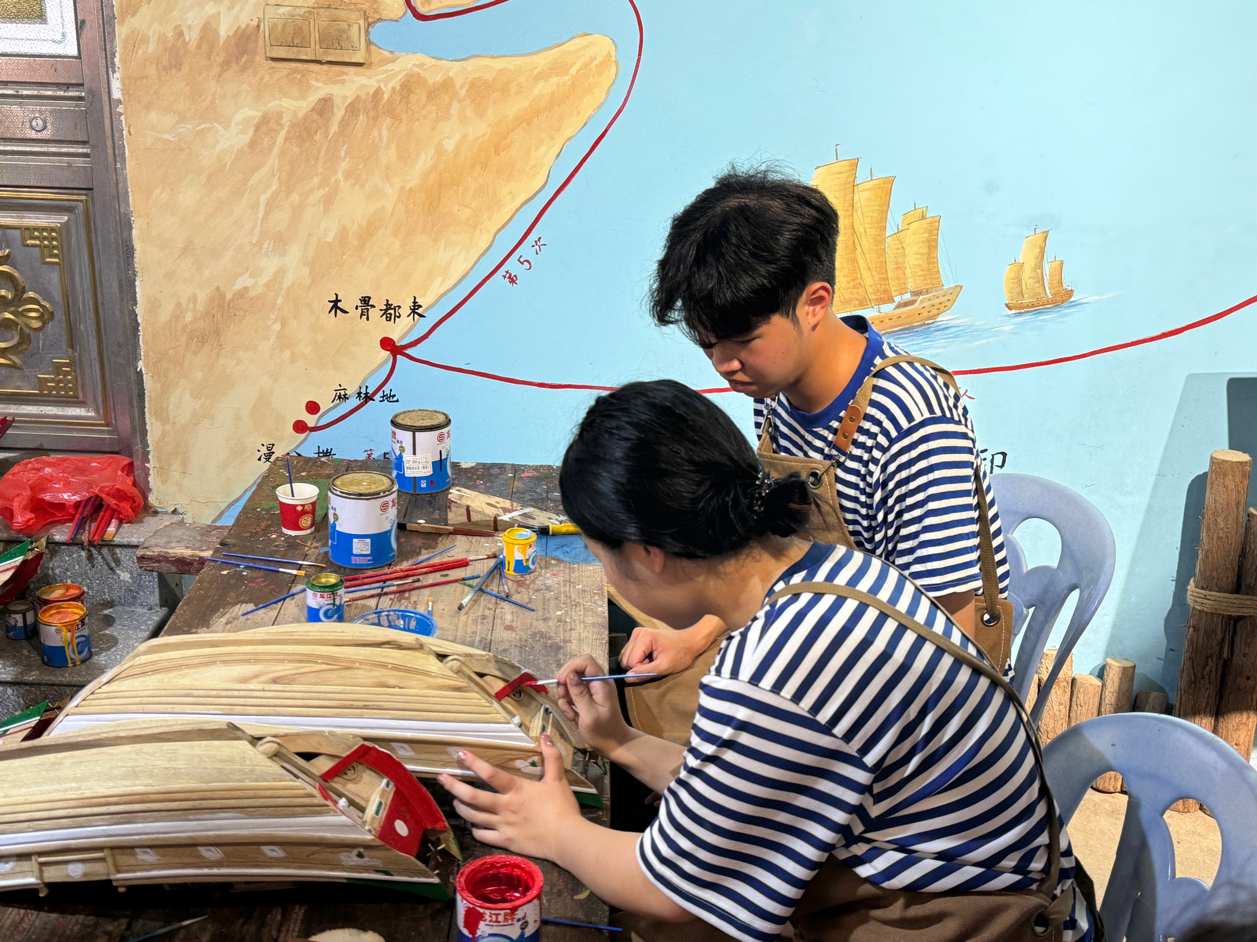 水密隔舱福船制造技艺被列入国家级非物质文化遗产。为深入一线学习此项工艺,实践队成员分别前往大福船模有限公司、福船古船模制作有限公司进行调研交流,并共建社会实践基地。通过访谈数名非遗传承人、一线工匠师傅,深入、直观地了解了该项技艺的制作工艺及传承现状。同时,师生们在工作坊动手实践打磨船体、上漆涂色的制作环节,感受非遗匠心。