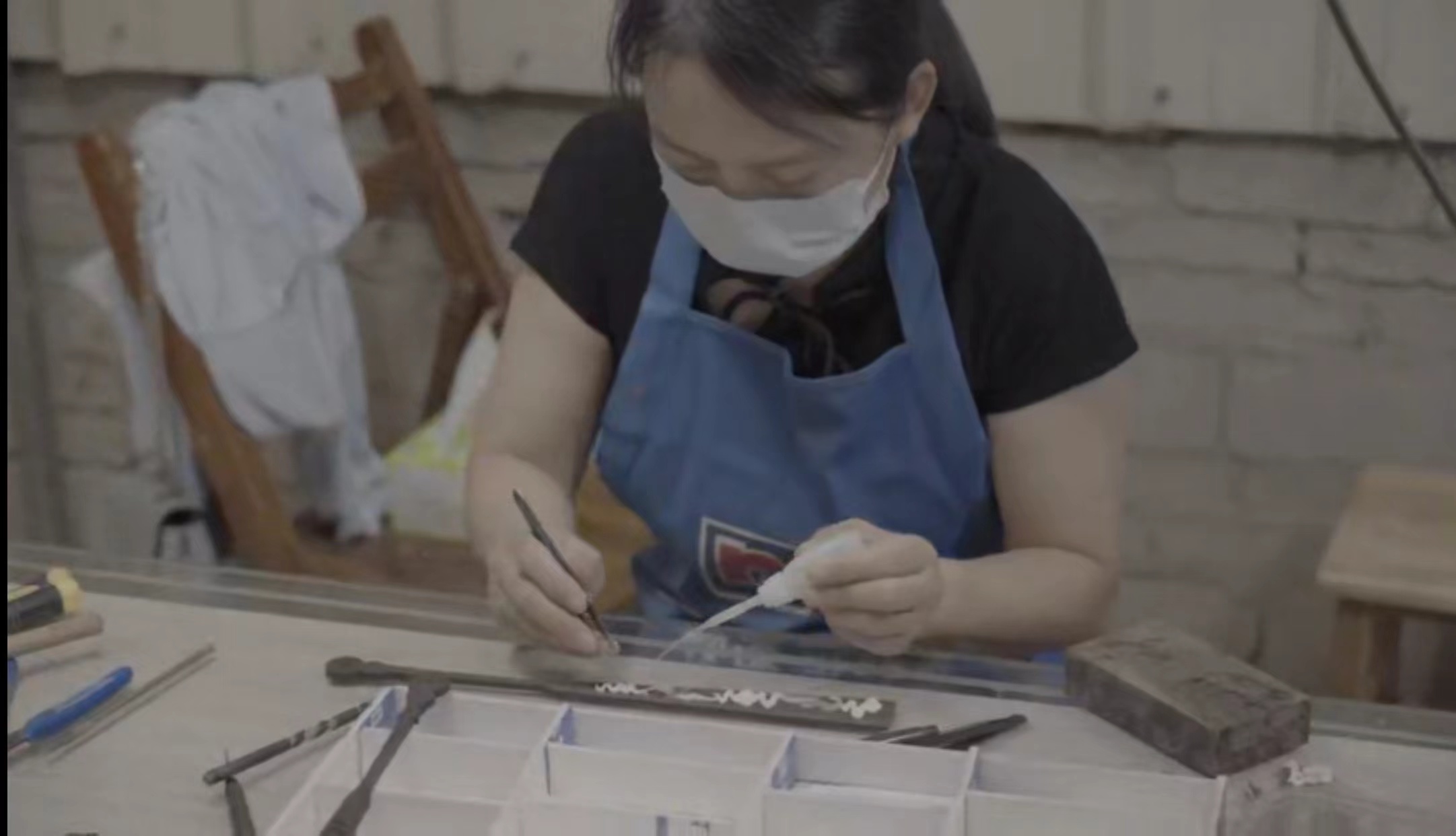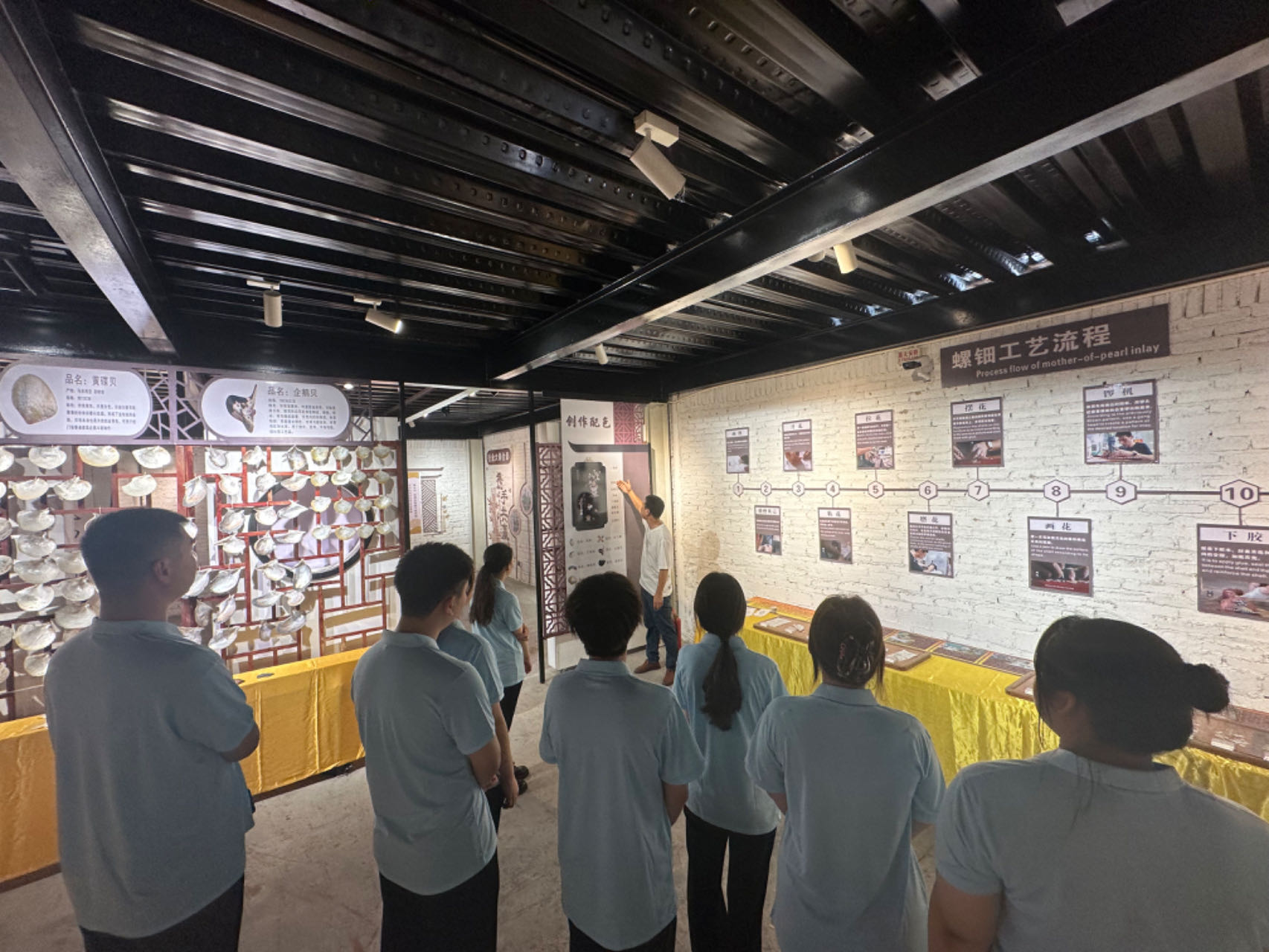 随后,实践队成员在传承人的带领下参观了螺钿的制作工序。工匠们将打磨好的螺钿薄片按照设计的图案小心地镶嵌在器物表面。每一个工序都需手工艺者拥有精准的眼力、细腻的手法和极大的耐心,以确保螺钿片与器物完美贴合,不留缝隙。每一件精美的螺钿作品都展现出匠人们的精湛技艺和辛勤付出,也体现出中国传统文化的博大精深和独特韵味。
