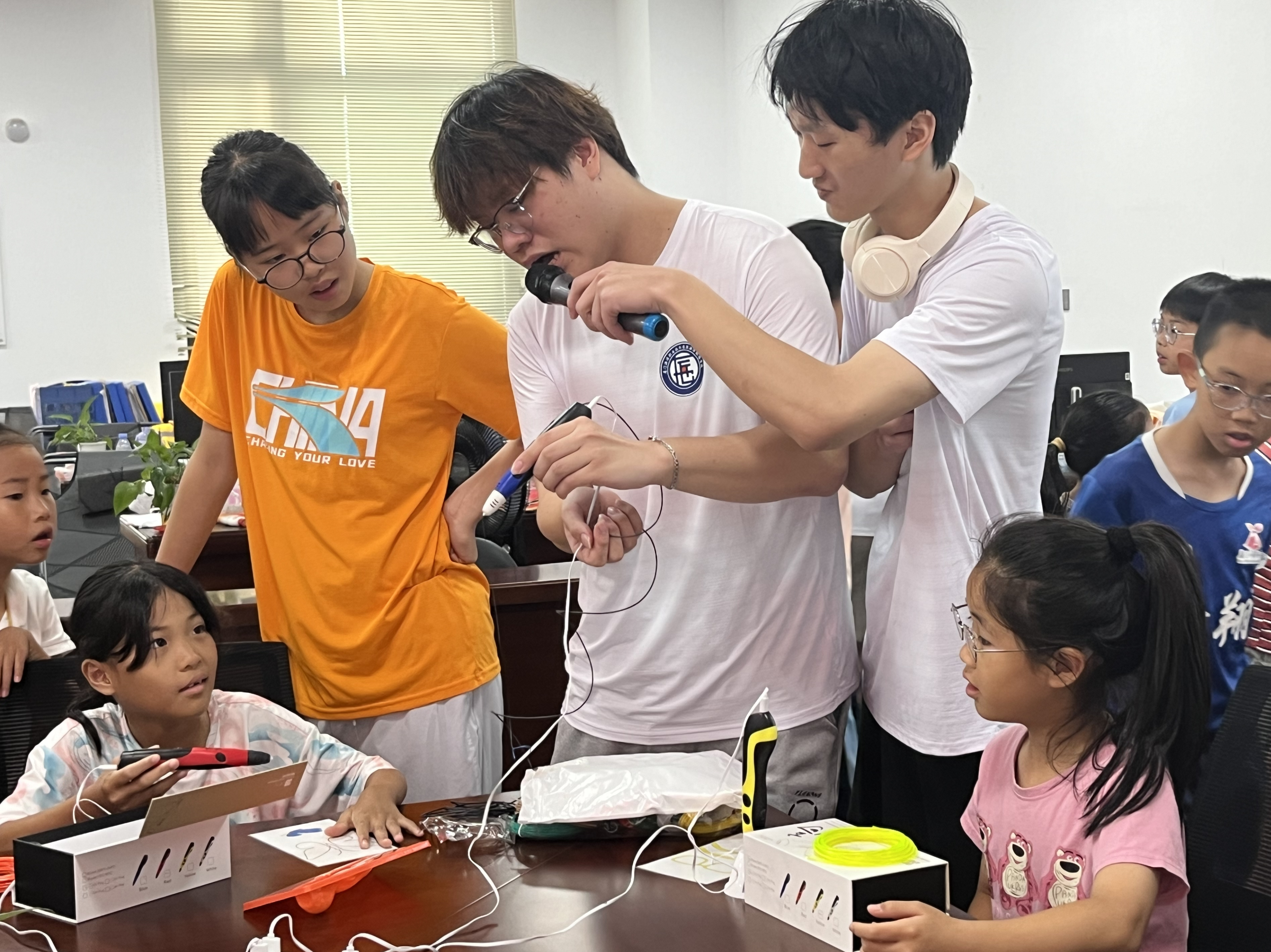 除了趣味课堂外,实践队还设计了3D打印笔的创意创作环节。每位队员负责一个区域,坐在小朋友们中间,手把手指导小朋友们如何正确操作,让他们参与其中,气氛热烈。小朋友们在哥哥姐姐的指导下,化身“神笔马良”,发挥想象力,DIY心仪的创意作品。不多久,一只只“小蝴蝶”“小眼镜”就像变戏法般出现在小朋友们的手中了。