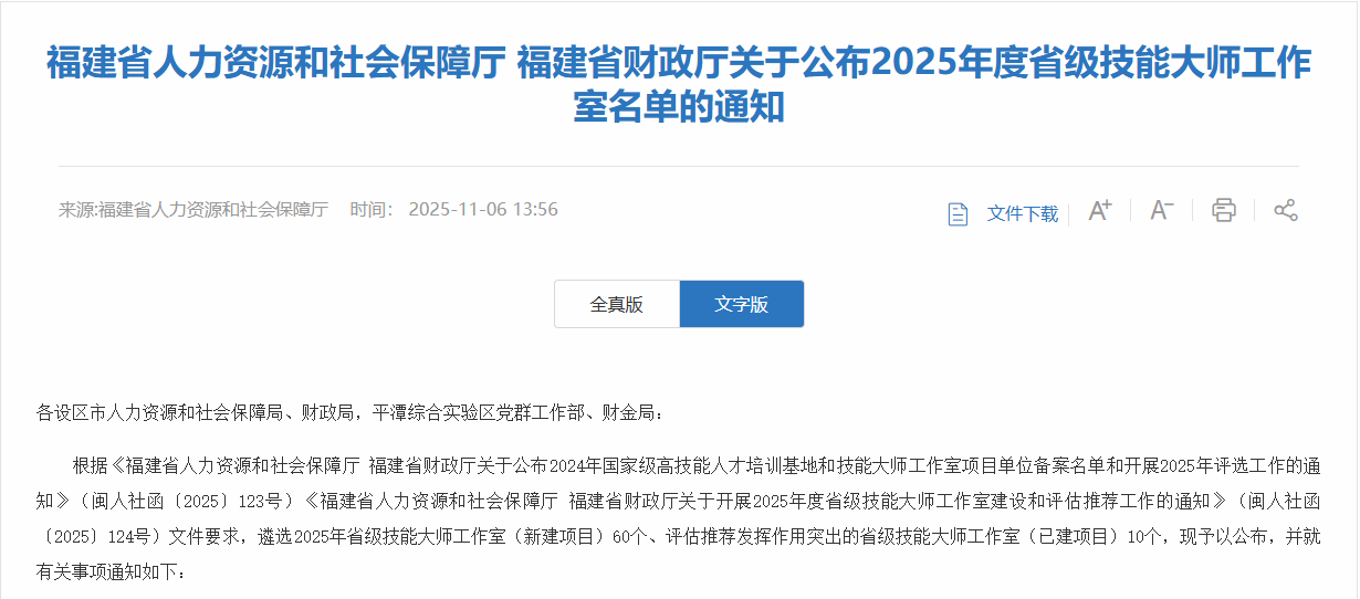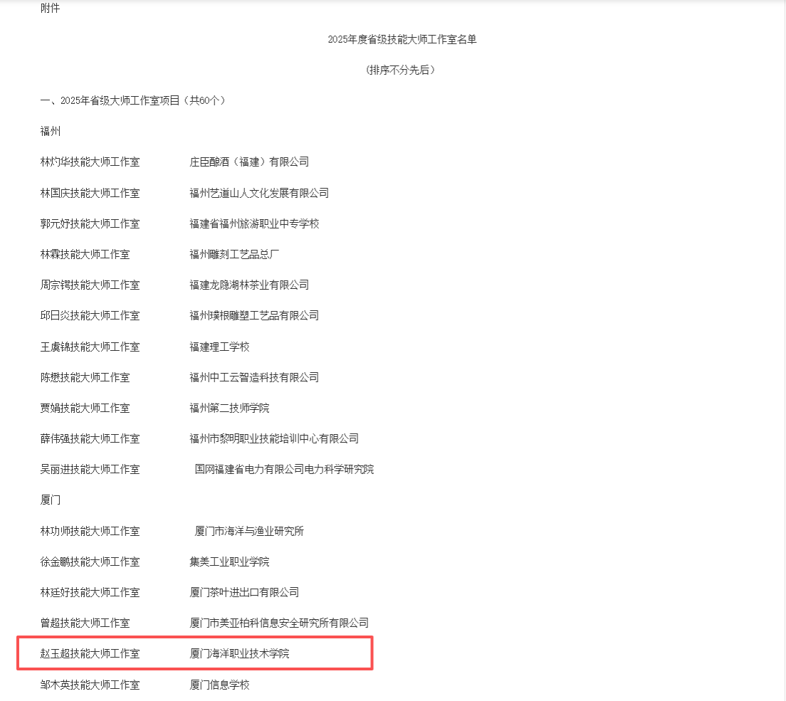 近日,福建省人力资源和社会保障厅、福建省财政厅联合公布《2025 年度省级技能大师工作室名单》,我校 “赵玉超技能大师工作室” 成功入选,成为我校首个获批的省级技能大师工作室。此次入选标志着我校在高水平 “双师型” 教学团队建设与技能人才培养领域实现新突破。