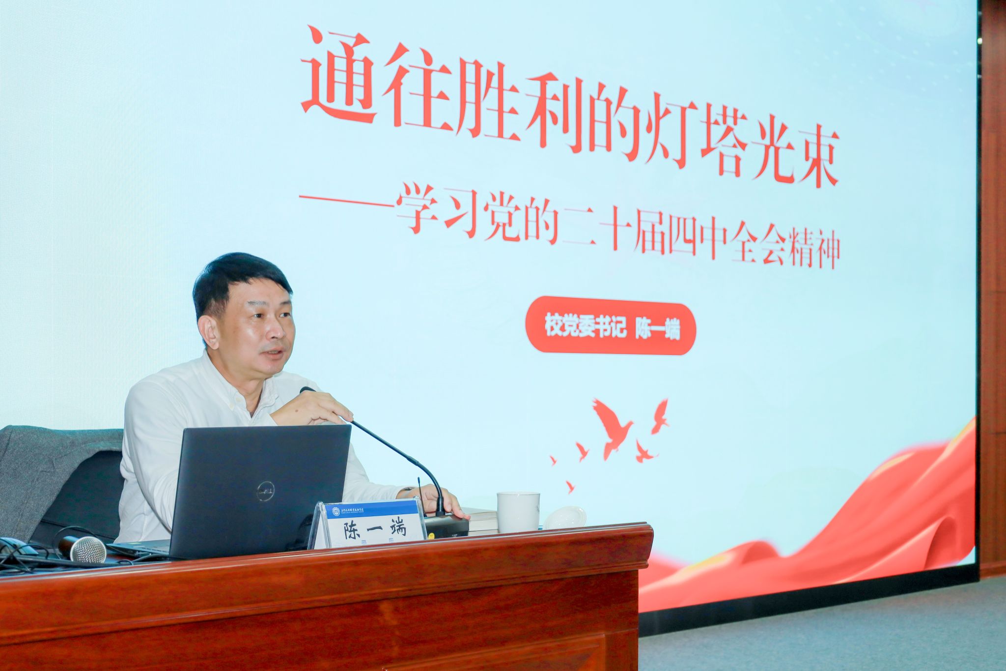 为深入学习贯彻党的二十届四中全会精神,凝心聚力,推动学校高质量发展,11月26日,校党委书记陈一端作学习党的二十届四中全会精神专题报告。在校党政领导班子成员出席。