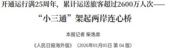 25年前的1月2日,“小三通”客运航线正式开通。25年来,“小三通”以厦金、福马、泉金为纽带,已累计运送旅客超过2600万人次,成为两岸民众重要的“黄金水道”、亲情之路和民生航线,在海峡两岸间架起连心桥。