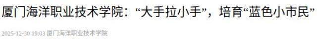 海洋是人类生存与发展的重要基石。亚太经合组织(APEC)海洋可持续发展中心2019年在厦门首次提出了“蓝色市民”概念,并于2023年厦门国际海洋周主论坛开幕式上正式发布了《蓝色市民倡议》,旨在提升全社会的海洋素养,培育和壮大关心海洋、认识海洋,乐于探秘海洋,选择为美丽海洋付诸行动的市民群体。厦门海洋职业技术学院作为福建省唯一以“海洋”命名的公办高校,积极发挥专业优势,与自然资源部第三海洋研究所共建“蓝色市民技能培训中心”,其中面向青少年广泛开展“大手牵小手,共育蓝色小市民”系列行动,以海洋教育塑造时代新人。