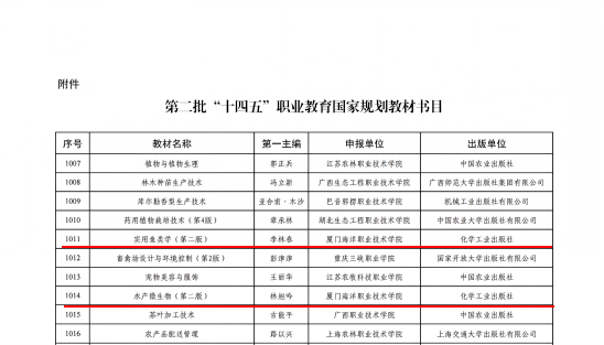 2026年1月26日,教育部职业教育与成人教育司公布了第二批“十四五”职业教育国家规划教材遴选结果,我校林旭吟教授、李林春教授任第一主编的《水产微生物(第二版)》和《实用鱼类学(第二版)》两部教材成功入选。