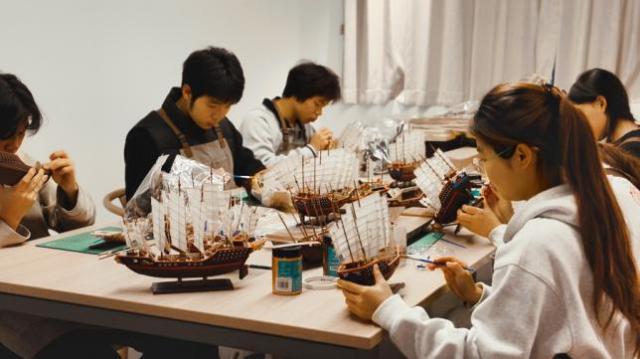 实践队回归教育本位,完成从科普服务到实体文创的实践转化。在学校海洋文化综合科普教育基地与船模大师工作室,实践队背靠学校船模创新班,与省级工艺美术大师合作,将研学探索所得转化为数字化图纸,通过工作室的机器加工,共同开发制作出船模、飞艇、书签、拼图、绳结等海洋主题文创产品与科普教具,实现从研学探访到实体产品的完整闭环。