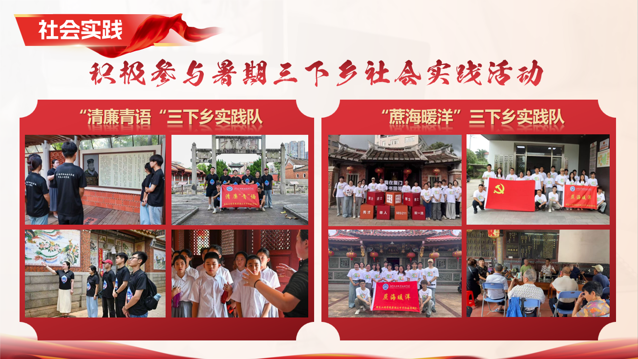 陈恒杰深知知行合一的重要性,积极投身社会实践与志愿服务,累计服务时长171小时。在2024年暑期“三下乡”社会实践中,他带领团队聚焦“廉洁文化”主题,创新融合数字技术,以青年视角解码厦门本土廉洁基因。通过打造沉浸式教育场景、开发清廉IP矩阵、构建“线上云展馆+线下研学营”双轨传播模式,为传统文化传承注入了鲜活的青春动能,体现了新时代青年的文化自信与创新担当。