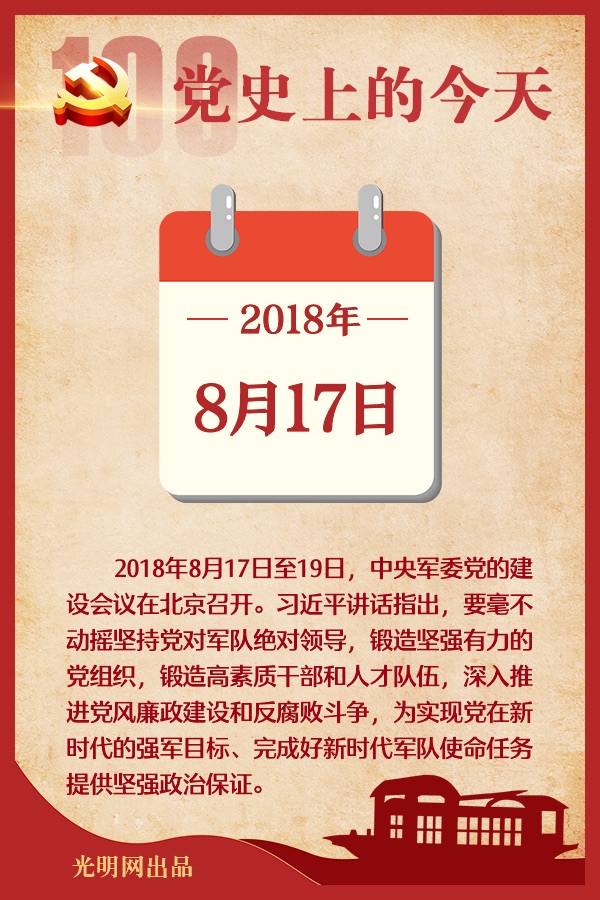 8月17日-19日中央军委党的建设会议在北京召开。习近平讲话指出,要毫不动摇坚持党对军队绝对领导,锻造坚强有力的党组织,锻造高素质干部和人才队伍,深入推进党风廉政建设和反腐败斗争,为实现党在新时代的强军目标、完成好新时代军队使命任务提供坚强政治保证。