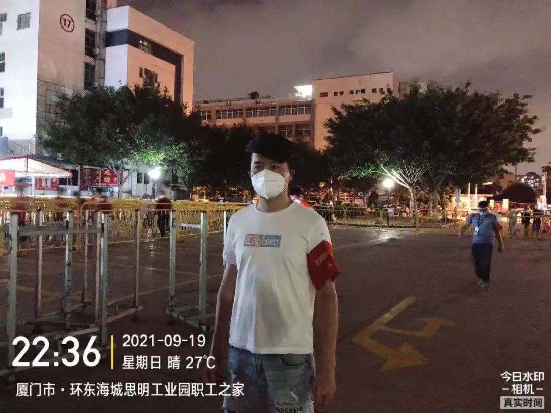 军旅游3192班的王小欢同学,坚持奋战在抗疫一线,主动请战,报名参加翔安市政集团组织到翔安区金海街道浦园社区全民核酸检测的党员志愿活动。他负责维护核酸检测现场秩序,手把手地指导社区居民进行核酸检测预约登记,协助医护人员进行信息登记,确保人员信息的准确无误。他连续长时间在核酸检测一线工作,直到社区全员核酸检测结束后才休息。