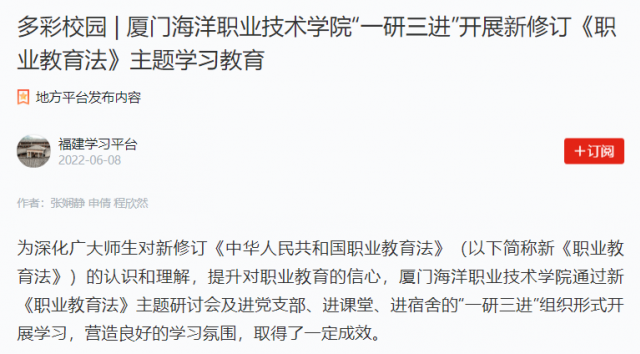 教师把新《职业教育法》学习带进课堂,通过课堂为学生们解读新《职业教育法》带来的影响,增强学生们对自身专业和职业教育的信心。录制《新内涵、新空间、新保障——新<职业教育法>“新”在哪》《既顶天又立地:下好职业教育民生这盘大棋》等思政公开微课,对新法之新、新法实施之路等进行分析,引导师生开展精度学习;开展“课前十分钟主题学习教育”,利用课前或课间十分钟,向同学们宣传贯彻新《职业教育法》,提升了全校师生对职业教育认可度,增强了职业院校师生的责任感和使命感。