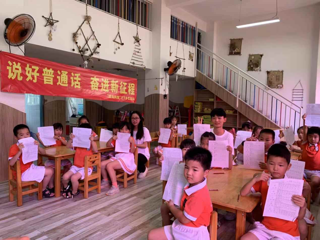 6月25日实践队队员们来到福建省泉州市惠安县东桥镇爱贝嘉幼儿园,为幼儿园的小朋友开展了充满童趣的普通话推广小课堂。志愿者用给小朋友们讲故事、唱儿歌、学拼音、做游戏引导他们练习普通话,感受中华语言的韵律和文字之美。